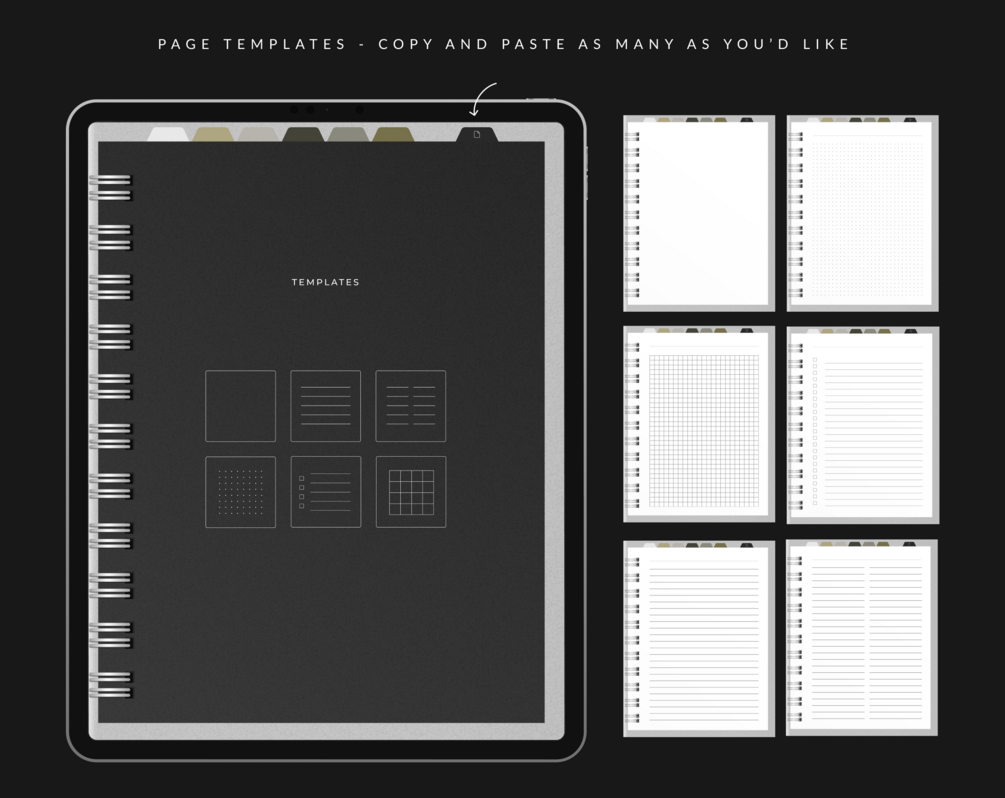 - 6 page templates: Blank, dotted, ruled(x2), grid, checklist, duplicate and use as many as you'd like